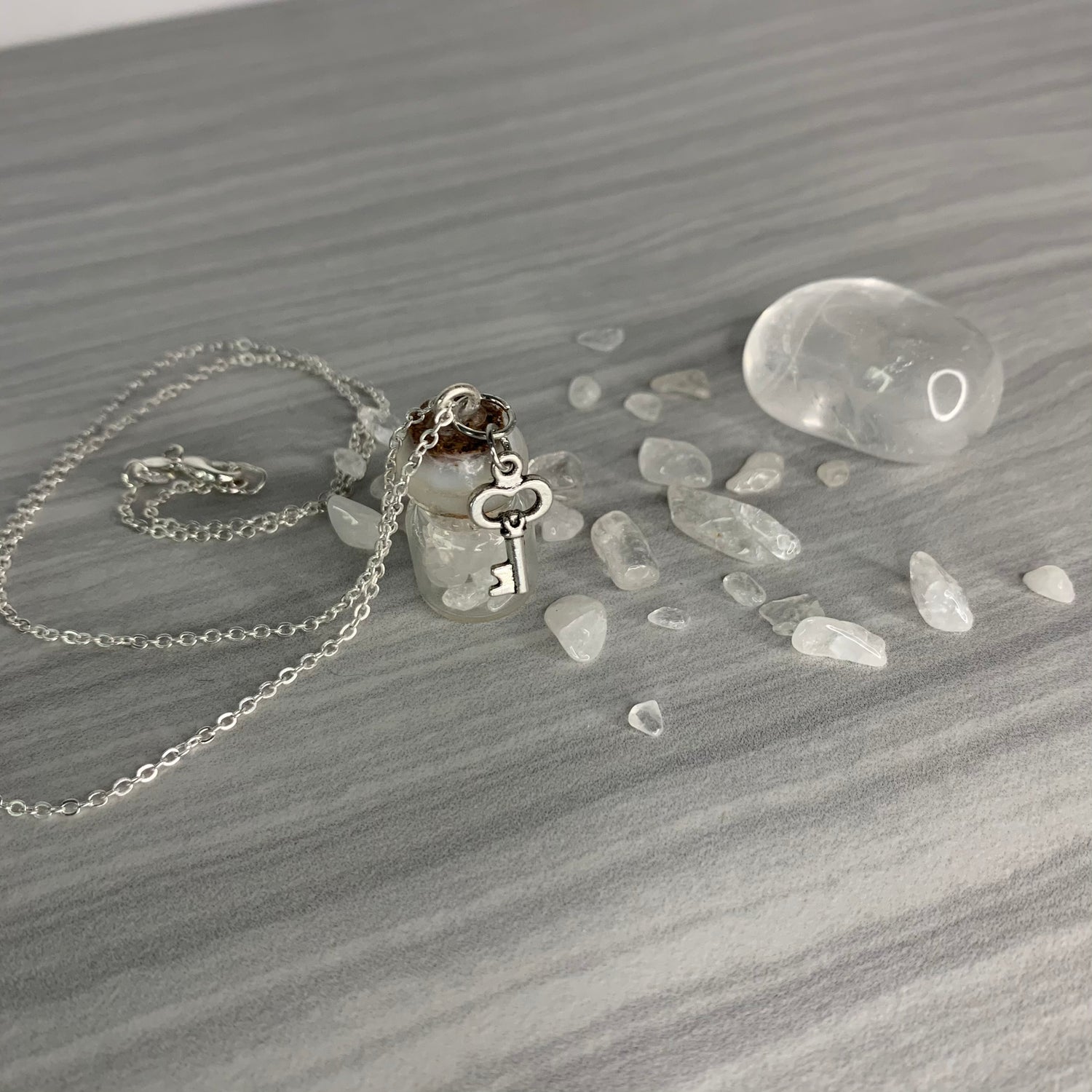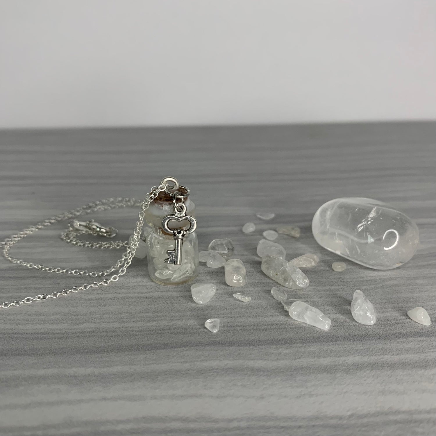 The necklace is a 1 ml glass jar with a cork, it is dipped in wax to seal the cork. It comes with an 18 inch silver plated chain along with a charm.