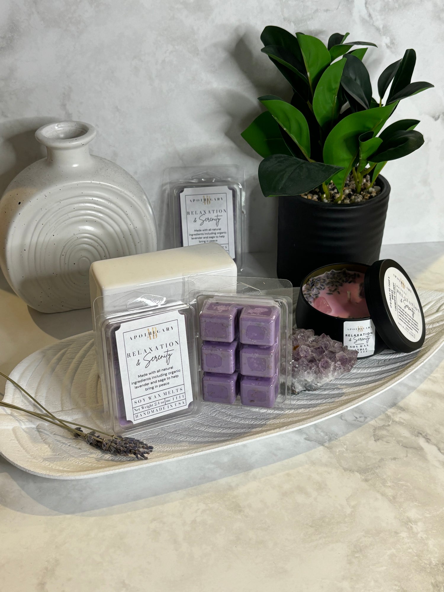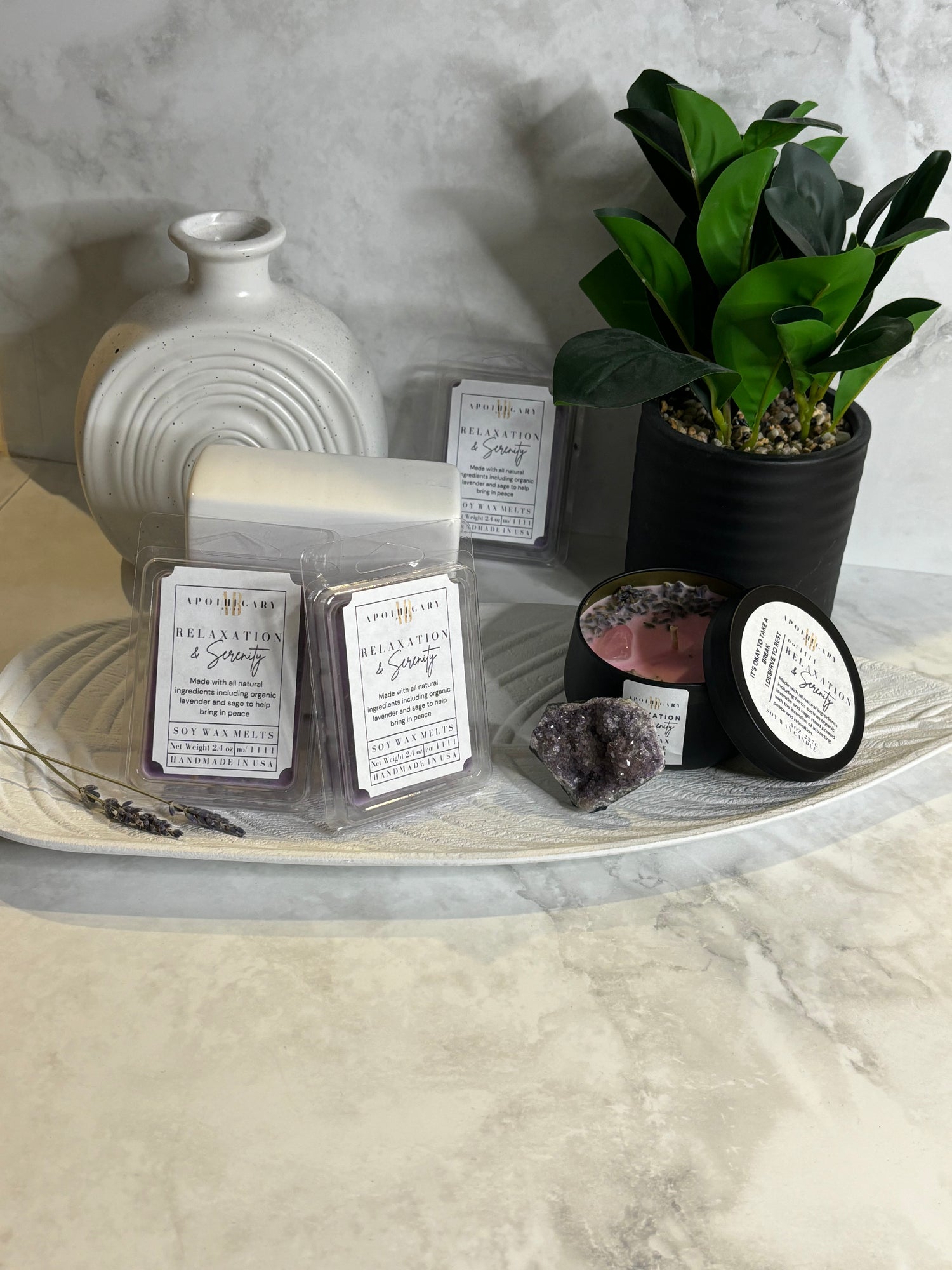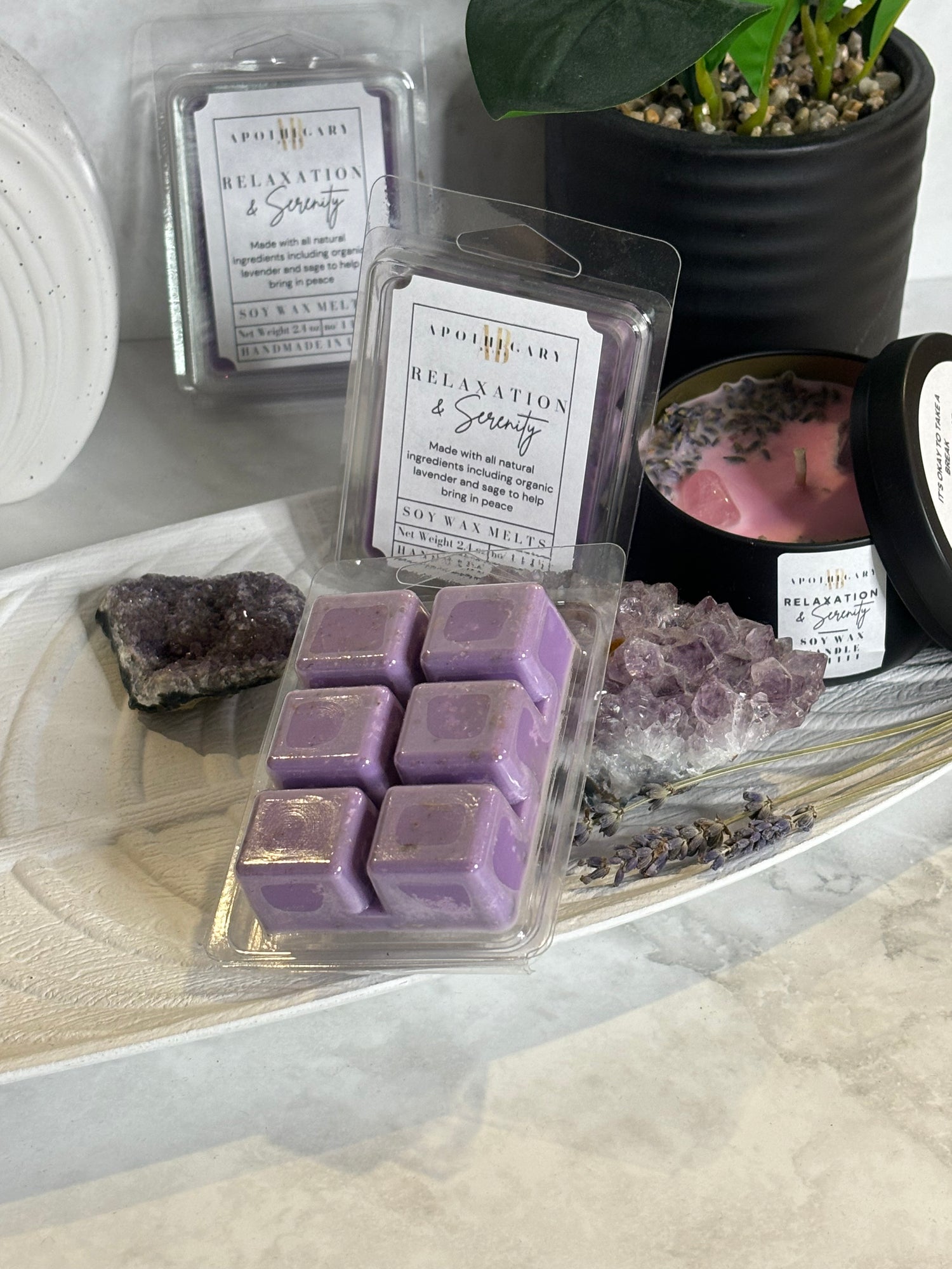 Our Relaxation & Serenity wax melts are made with all-natural soy wax, pure Lavender essential oils with organic Lavender petals and Organic Sage Herbs. Each wax melt is hand-poured with the intention of bringing in relaxation and happiness into your life. These wax melts make the perfect house-warming gift as they are ideal for manifesting peace and harmony.