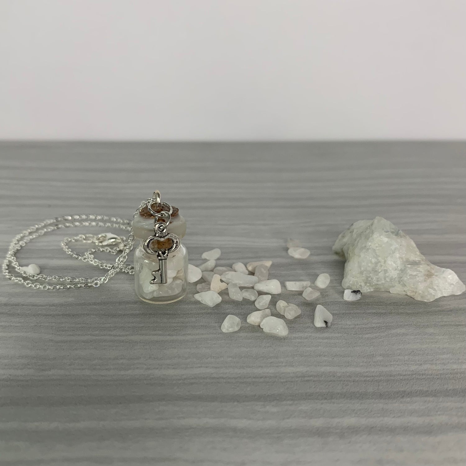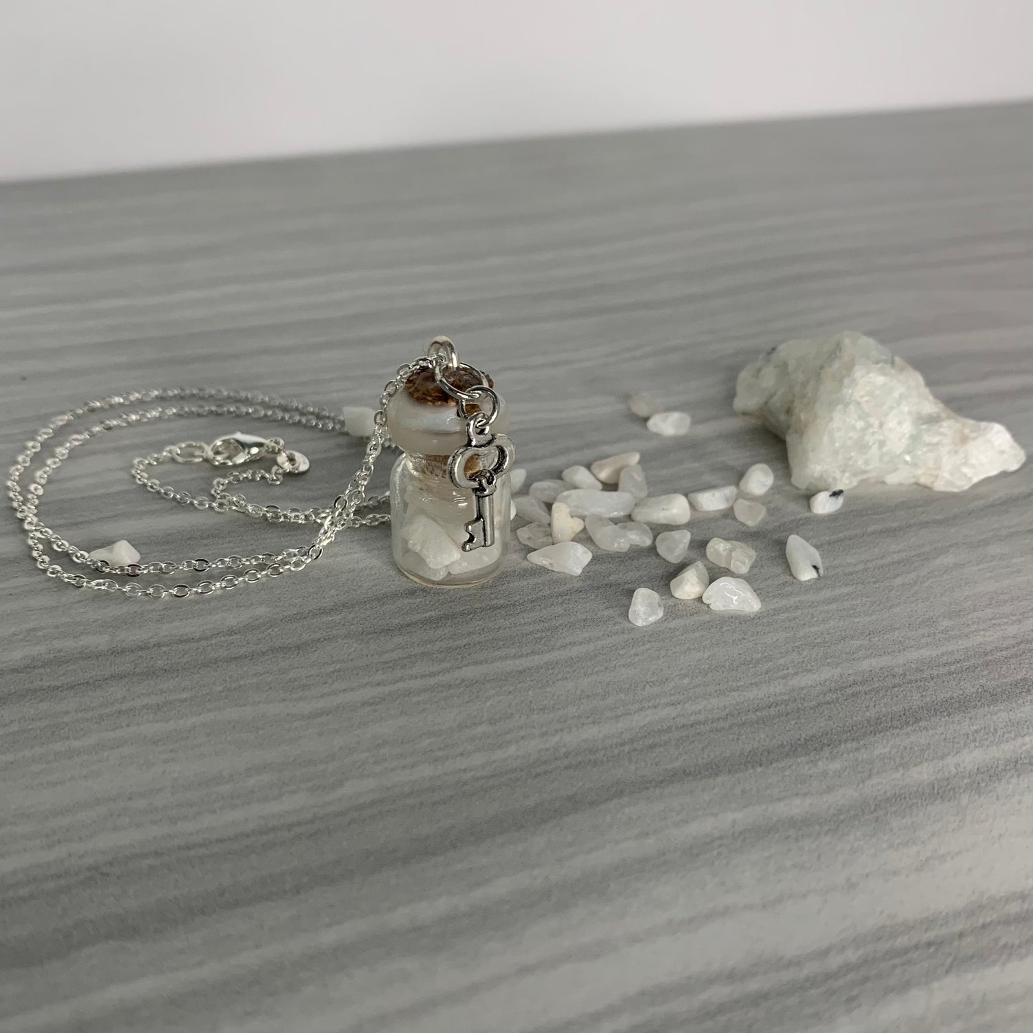 The necklace is a 1 ml glass jar with a cork, it is dipped in wax to seal the cork. It comes with an 18 inch silver plated chain along with a charm.